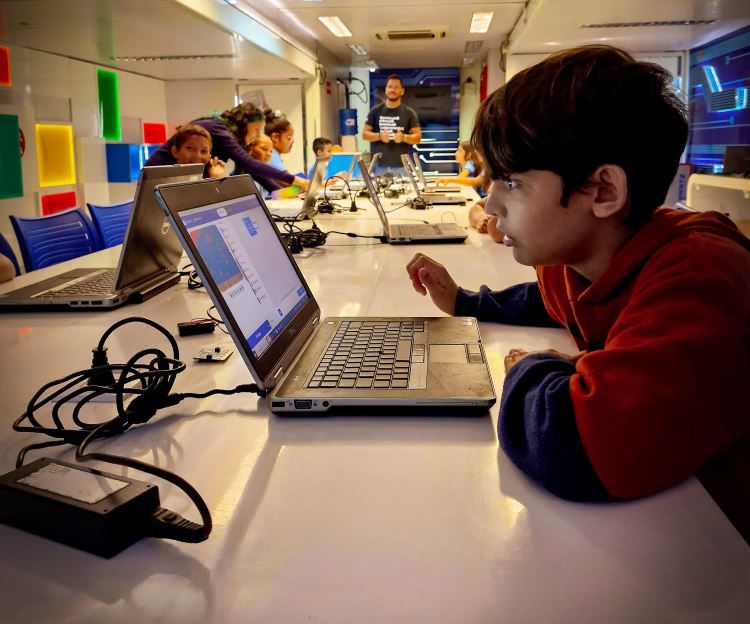 Neste verdadeiro ambiente de aprendizagem sobre rodas, são desenvolvidas visitas monitoradas de cunho informativo e de experiências com a utilização de kit de robótica educacional, softwares de programação e de simulação de circuitos eletrônicos, impressoras 3D, robôs humanoides, entre outros.